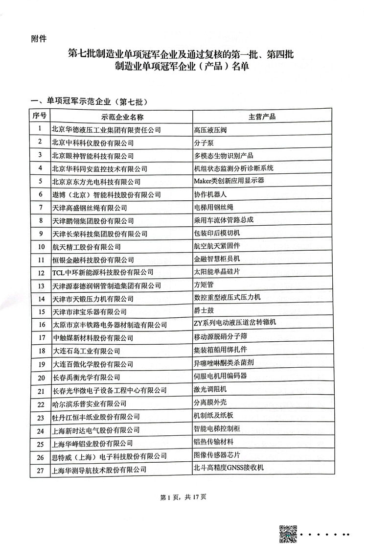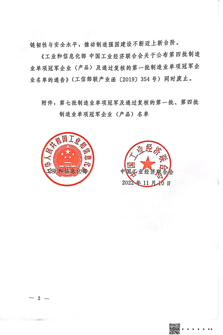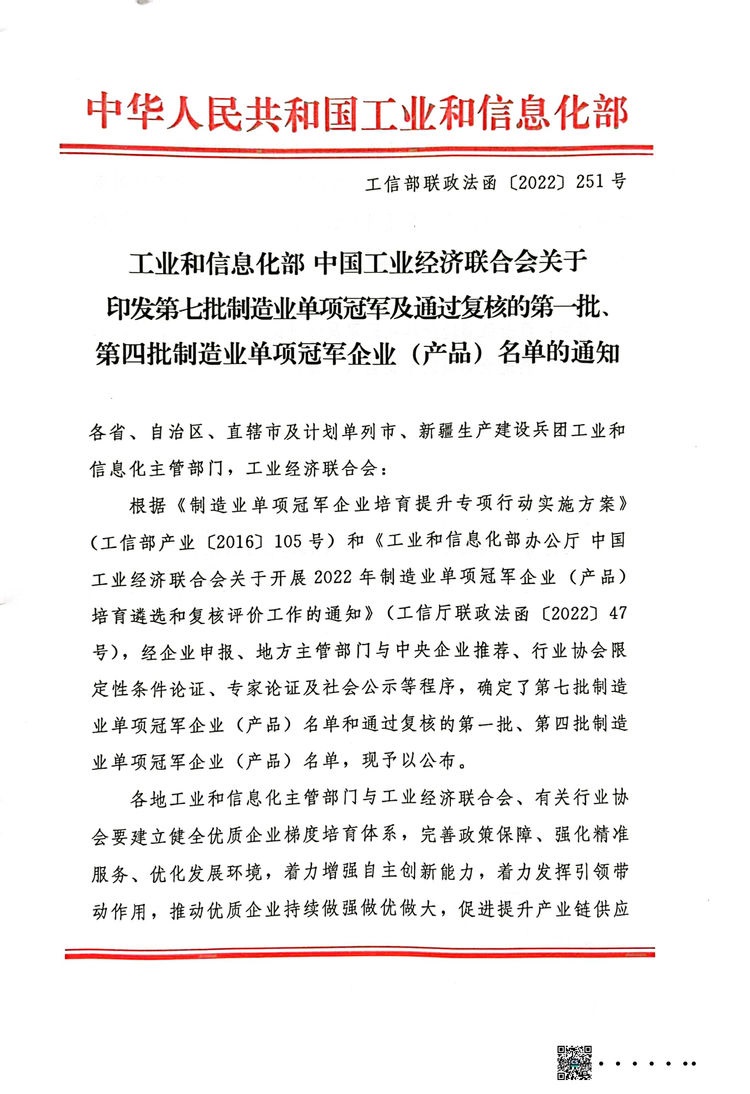 根據(jù)《工業(yè)和信息化部辦公廳 中國工業(yè)經(jīng)濟(jì)聯(lián)合會關(guān)于開展2022年制造業(yè)單項(xiàng)冠軍企業(yè)(產(chǎn)品)培育遴選和復(fù)核評價(jià)工作的通知》,工業(yè)和信息化部、中國工業(yè)經(jīng)濟(jì)聯(lián)合會組織開展了第七批制造業(yè)單項(xiàng)冠軍企業(yè)(產(chǎn)品)培育遴選和第一批、第四批制造業(yè)單項(xiàng)冠軍企業(yè)(產(chǎn)品)復(fù)核工作,并公布名單。