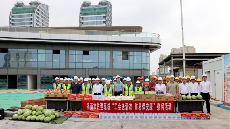 2025年8月6日,市住房和城鄉(xiāng)建設(shè)局赴集團公司在建項目現(xiàn)場,組織開展“工會送清涼、防暑保安康”慰問活動。市住建局二級巡視員、黨建和人才工作派駐指導員安紀文,一級調(diào)研員、市建設(shè)工會主席梁敏,機關(guān)黨委副處長徐帥,組織人事處三級主任科員董宇等出席活動;集團公司黨委副書記、副總經(jīng)理劉學深,黨委委員、副總經(jīng)理馮樹國,黨委委員、總經(jīng)濟師張兆奎,黨委委員、副總經(jīng)理逯兆慶,總經(jīng)理助理張宗志,副總工程師王廣川,在建項目管理人員及一線建設(shè)職工代表等共計60余人參加活動。