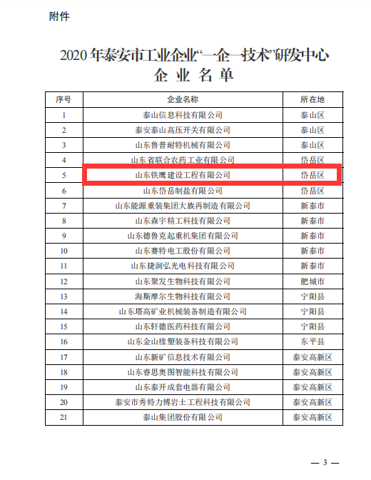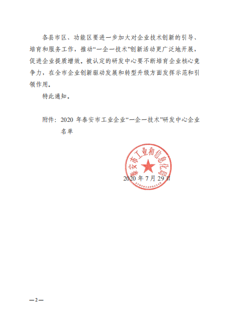 根據(jù)《山東省工業(yè)企業(yè)“一企一技術(shù)”研發(fā)中心培育認(rèn)定工作指南》(魯工信技【2020】37號(hào))文件精神,經(jīng)縣市區(qū)推薦,市局審核,我公司順利被認(rèn)定為2020年泰安市級(jí)“一企一技術(shù)研發(fā)中心”。