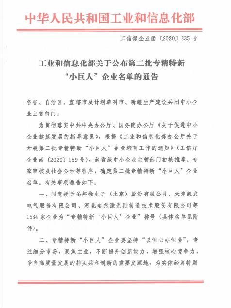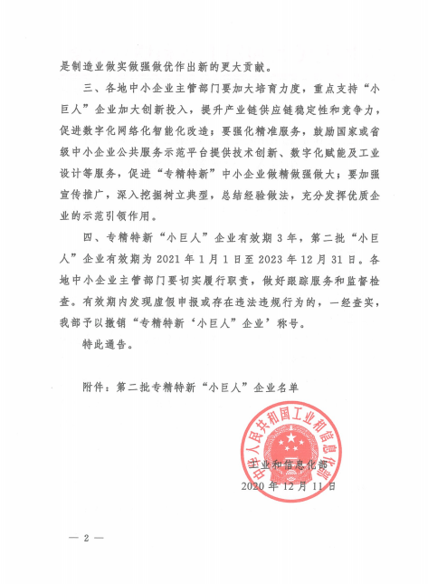 今日,我公司榮獲國家第二批專精特新“小巨人”榮譽(yù)稱號(hào)。專精特新“小巨人”企業(yè)的評(píng)選是工業(yè)和信息化部貫徹落實(shí)中辦、國辦《關(guān)于促進(jìn)中小企業(yè)健康發(fā)展的指導(dǎo)意見》,根據(jù)《工業(yè)和信息化部辦公廳關(guān)于開展第二批專精特新“小巨人”企業(yè)培育工作的通知》(工信廳企業(yè)函〔2020〕159號(hào))要求,經(jīng)各省級(jí)中小企業(yè)主管部門初核和推薦、行業(yè)協(xié)會(huì)限定性條件論證、專家審核等流程,最后給予認(rèn)定授牌,是全國中小企業(yè)評(píng)定工作中的最高等級(jí)、最具權(quán)威的榮譽(yù)稱號(hào)。專精特新“小巨人”企業(yè)是“專精特新”中小企業(yè)中的佼佼者,是專注于細(xì)分市場、創(chuàng)新能力強(qiáng)、市場占有率高、掌握關(guān)鍵核心技術(shù)、質(zhì)量效益優(yōu)的排頭兵企業(yè)。