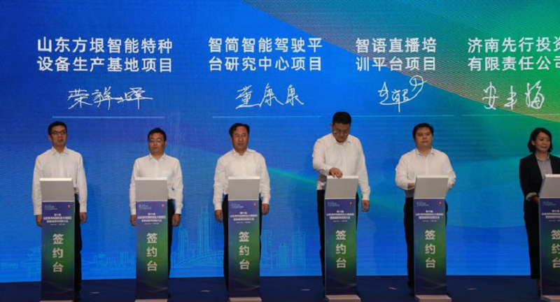 集團(tuán)副總經(jīng)理榮祥峰(左三)代表山東方垠智能裝備有限公司與起步區(qū)簽約